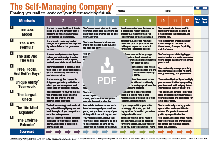 Download The Self-Managing Company® Scorecard below to score yourself according to the eight mindsets discussed in this book. Read through the four statements for each mindset and give yourself a score of 1 to 12 based on where your own mindset falls on the spectrum. Put each mindset’s score in the first column at the right, and then add up all eight and put the total at the bottom. Now, think about what scores would represent progress over the next quarter. Write these in the second scoring column, add them up, and write in the total.